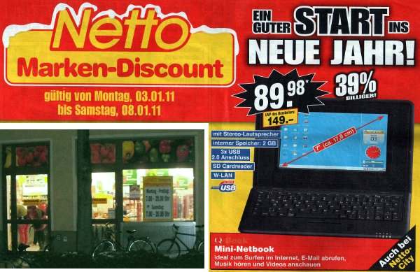 Also Netto-Seite aufgerufen und Prospekt angeschut. Ja, da issa auch gleich auf der Titelseite. Erzaehlt auch nicht mehr, als im Artikel steht. Ladenfinder angeklickt ung geschaut wo der nächste Netto ist. Die Suche war zwar erträglich flott, aber die Sortierung hatte nix mit Nähe zu meinem Wohnort zu tun. Auch ein rumfummeln mit den Parametern half nicht, also doch wieder Hirn einschalten und Adressen in der Liste lesen und überlegen was in der Nähe ist. Na ja, ist ja nur so 1000m. Auch beim einstieg mit dem Laden kommt das gleich Prospekt mit dem Hinweis dass es den Rechner da gibt. Also Beine in die Hand und Los.