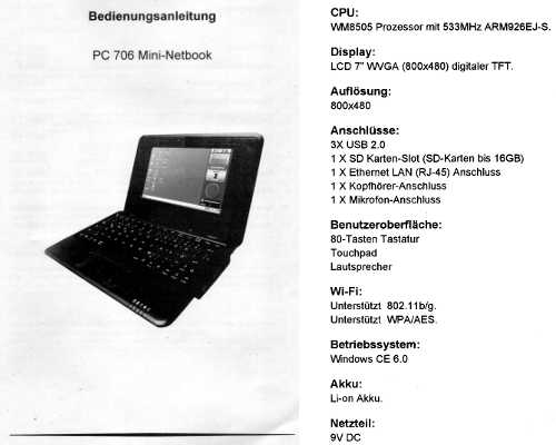 Auf umfangreichene 44 Seiten und nur auf Deutsch werden alle Komponenten und Programme kurz aber ausreichend erklärt. Obendrein sind auch alle Screensshots auf Deutsch und scheinbar von der installierten Software. Darüber hinaus wird auch die Installation eines UMTS-Sticks von Tschibo/O2 beschrieben. Inklusive des Hinweises dass es sich dabei um UMTS-Sticks auf Huawei E1550 Basis handelt (und damit wohl auch für alle anderen, ggf. Simlockfreien Varianten passen duerfte). Und ja, auf dem Titelblatt wird der Netbook als PC 706 Mini-Netbook