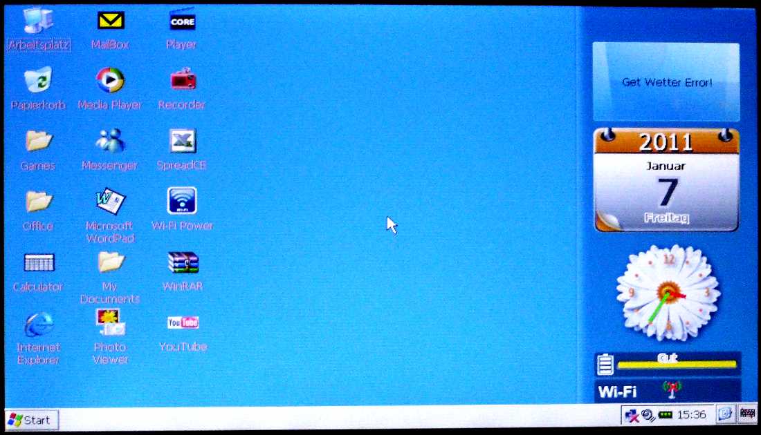 Der Schirm wirkt kräftig und gut ausgeleuchtet. Links 3 Reihen Bildchen, rechts ein paar Widgets (Wetter in China (*9), Uhr, Datum und W-Lan-Zustand). Das Touchpad reagiert ein bischen hakelig., ansonsten aber ganz nett. Lanstecker rein und IE angeklickt. DHCP klappt, der verbindungsaufbau ist etwas zaeh. aber immerhin, IPv6 wird unterstuetzt. Na ja, einen Windows-CE Test wollte ich nicht machen, die grundsätzlichen Versprechungen auf der Packung scheinen aber erstmal eingelöst.